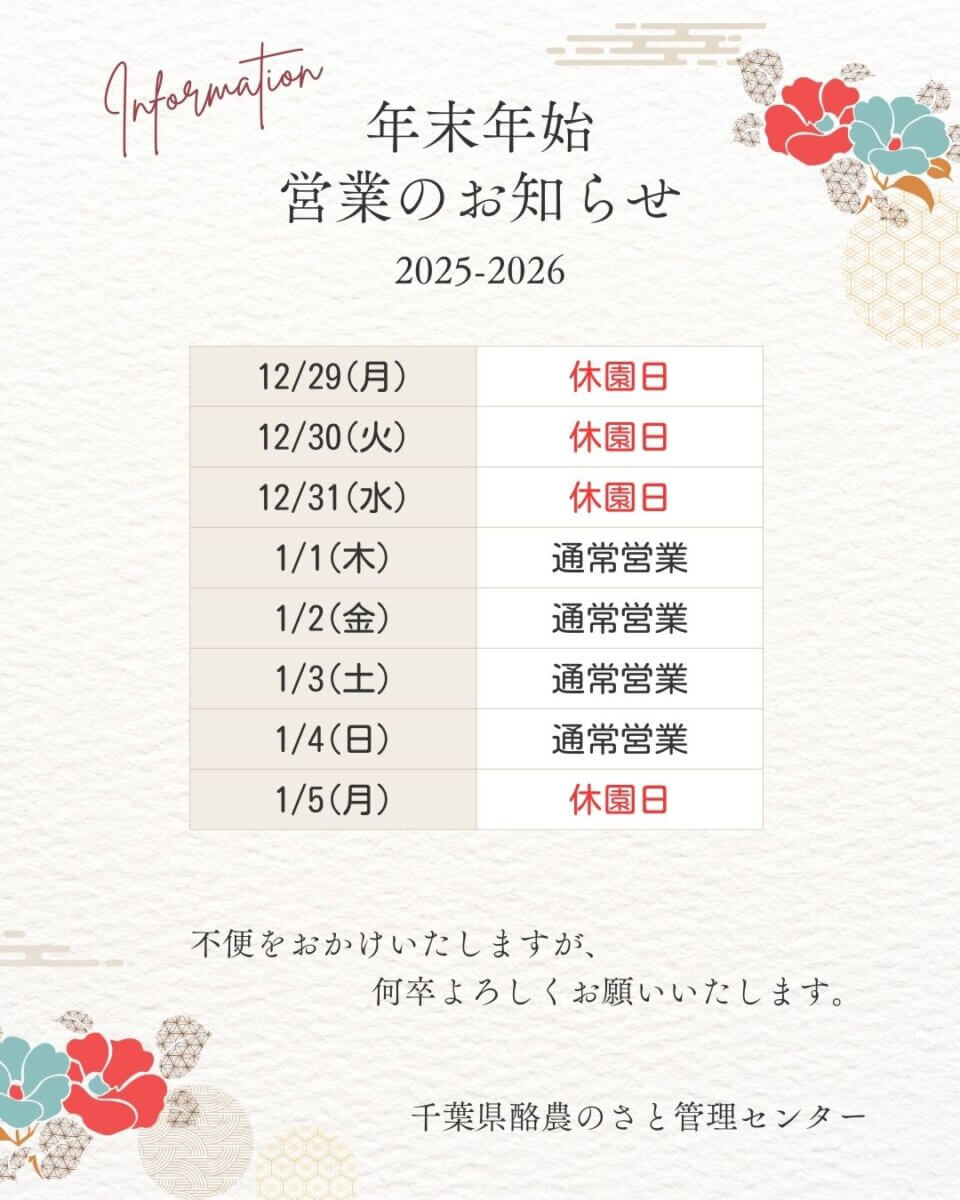 年末12月29日(月)から12月31日(水)まで休園とさせていただきます。なお、年始は元旦(1月1日)より通常通り営業いたします。皆様のご来園お待ちしております。