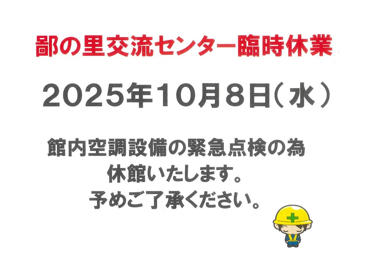 館内設備の緊急点検の為、鄙の里交流センターはお休みとなります。 なお、当日は、直売所「土のめぐみ館」に道の駅スタンプを移動してご利用可能となっております。 道の駅ガチャピンズも同様です。予めご了承ください。