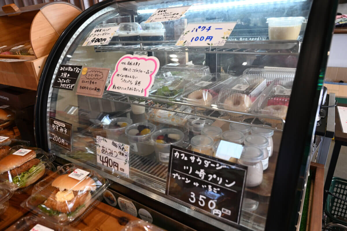 また冷蔵ショーケースにはオリジナル商品のコーヒーゼリーやプリン、あんみつなどのスイーツに加え、パクチーやゆずみそなどもありました。