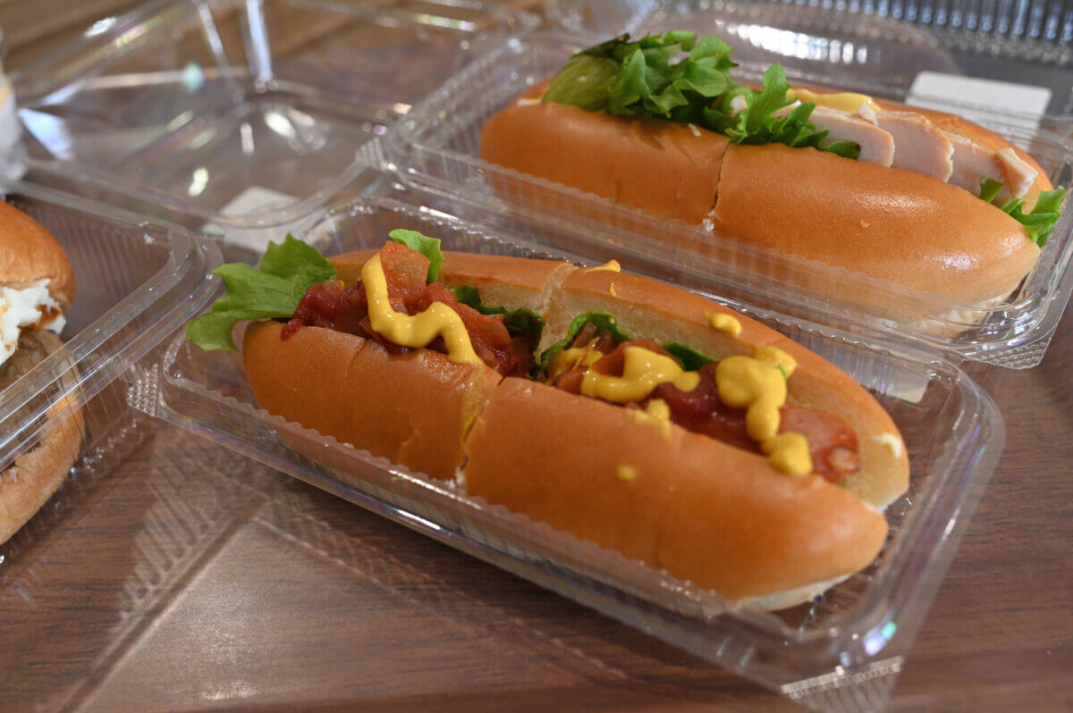 美味しそうなお惣菜パンがずらりと並んでいます。この日はハンバーガー、メンチカツバーガー、ホットドッグなど5種類がありました。温めてくれるサービスもあるそうです。