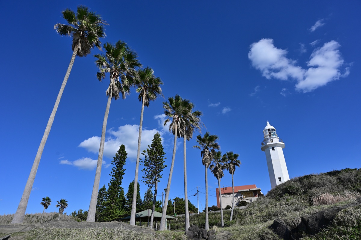 明治2年(1869)にフランス人技師、ウェルニーの設計によってつくられた日本最初の洋式8灯台のひとつです。白亜の灯台が美しく、展望台からの眺望は抜群。岬の先端には、「最南端の碑」もあります。最南端の夕日スポットです。