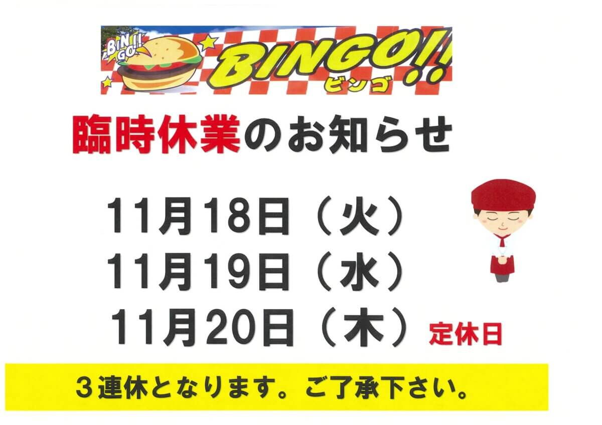 ビンゴバーガーは、11月18日~11月20日の間、休業いたします。