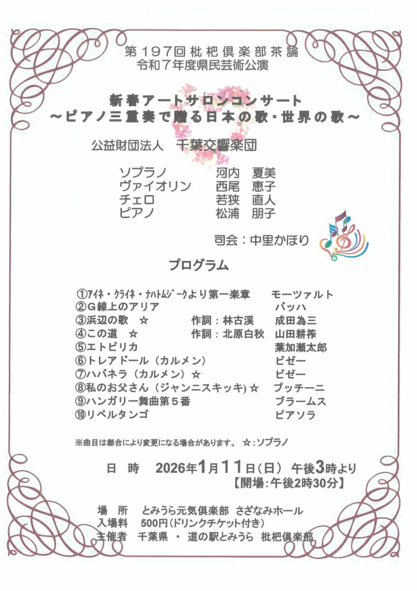 ピアノ三重奏の奏でにのせて、ソプラノの歌声も響きます。『G線上のアリア』『エトピリカ』『私のお父さん』『浜辺の歌』『この道』『リベルタンゴ』など楽しんで頂きます。