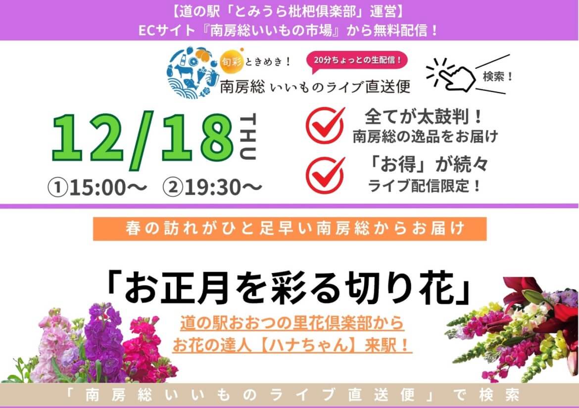 新しい年を迎えるにあたり、お正月を彩る南房総の花々を、12月18日木曜日の昼・夜の2回の『ON AIR!』(生配信)で紹介していきます。南房総の花々で彩るお正月にふさわしい飾り方も併せてご案内します。