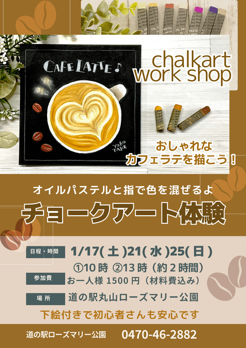 オイルパステルと指で色を混ぜて15センチ角の黒板に「カフェラテ」を描きます