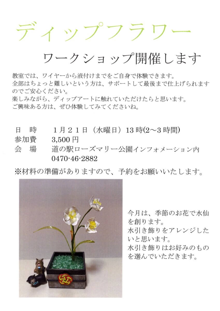 ワイヤーから液つけまでを体験できます。サポートもいたしますので、お気軽にご参加ください。今月は水仙です。お好みの水引の飾りをアレンジ。