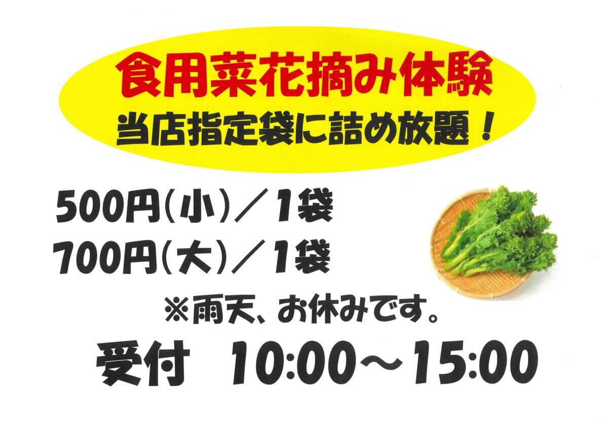 菜花摘み体験を始めます。小袋500円 大袋700円