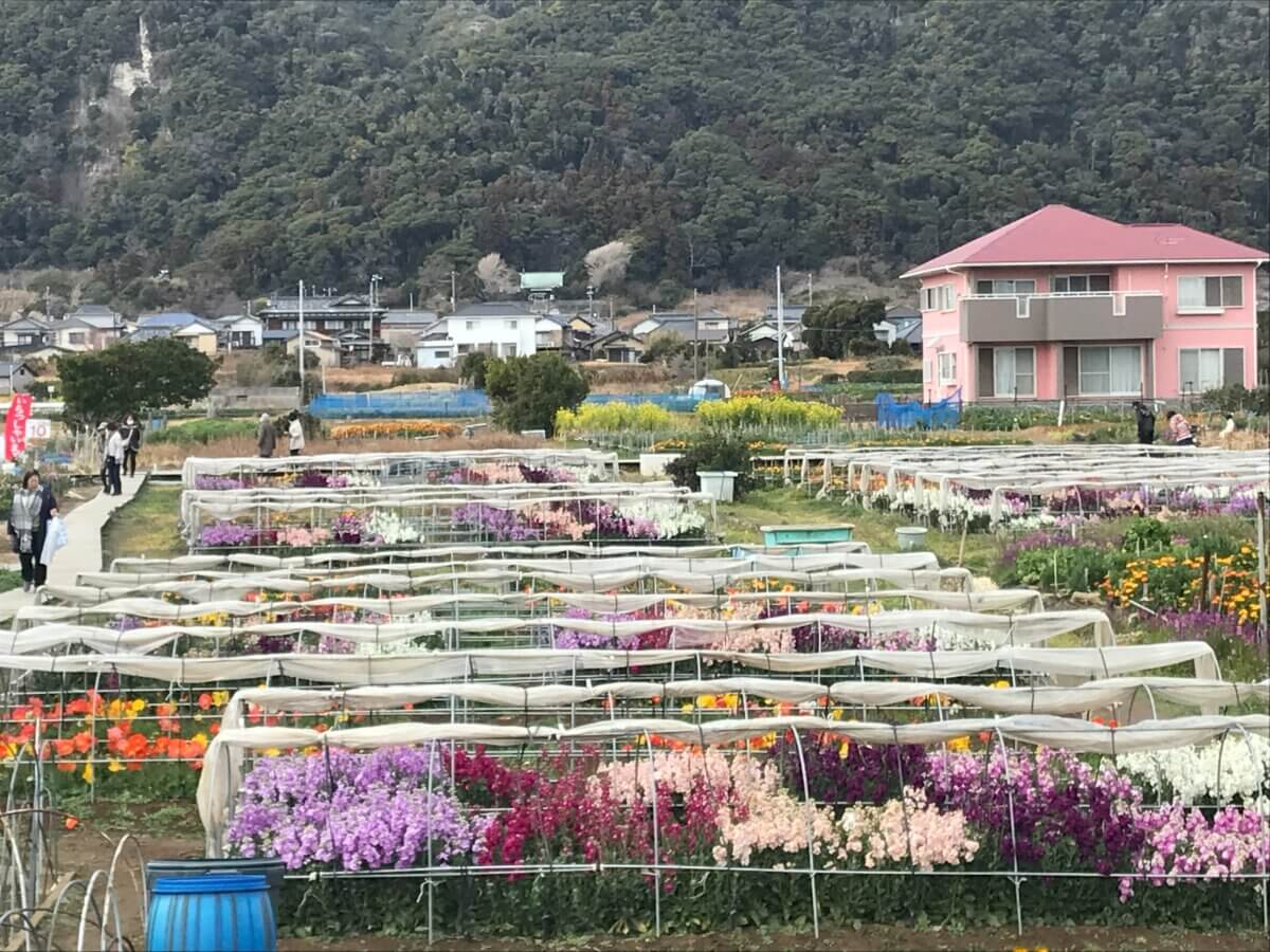 道の駅ちくら・潮風王国の向かいに広がる千倉町千田地区の露地花畑が見頃を迎え、観光客やバスツアーの方々で賑わっています。