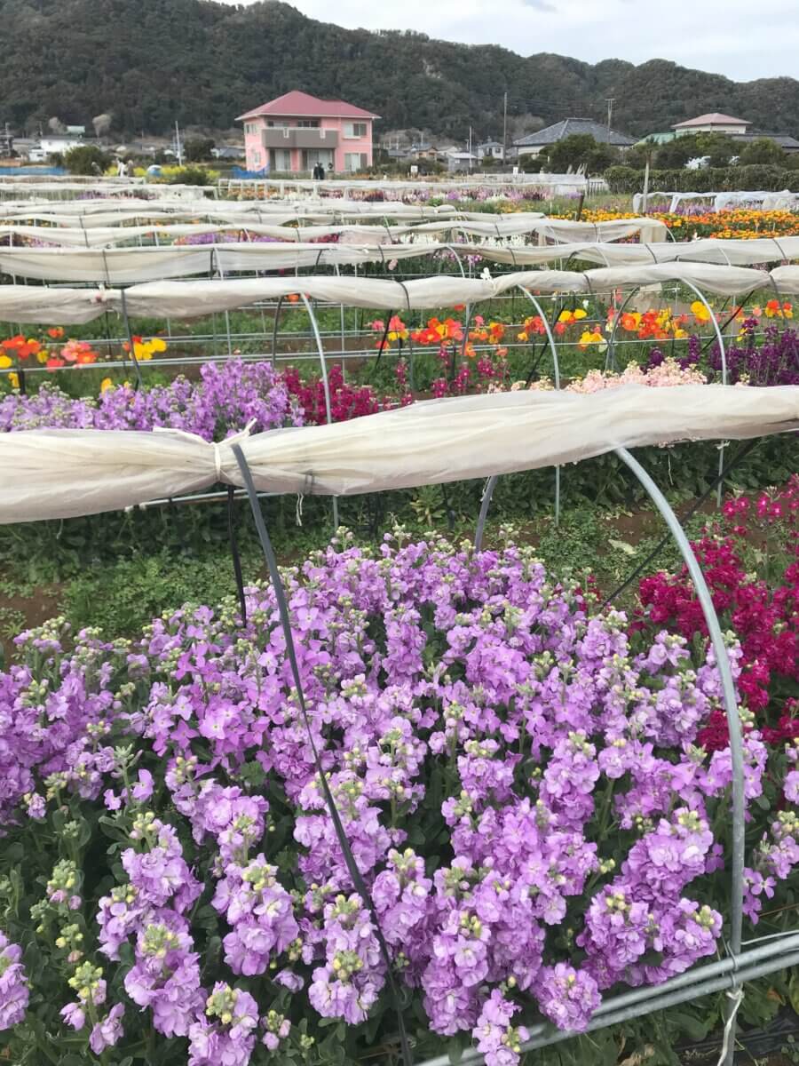 道の駅ちくら・潮風王国の向かいに広がる千倉町千田地区の露地花畑が見頃を迎え、観光客やバスツアーの方々で賑わっています。