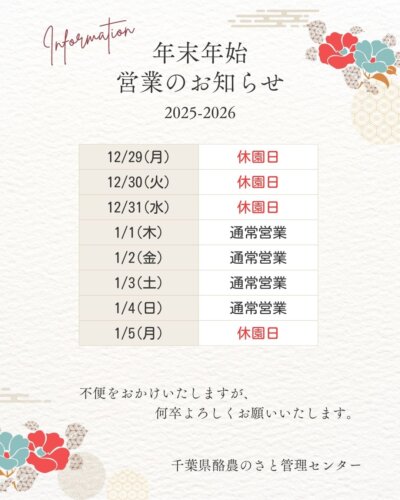 年末12月29日(月)から12月31日(水)まで休園とさせていただきます。なお、年始は元旦(1月1日 […]