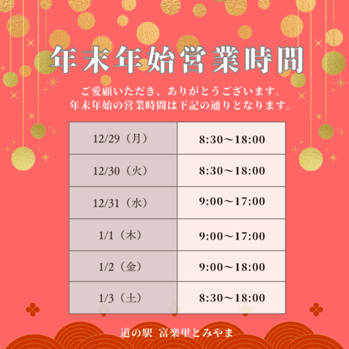 年末年始の営業時間です。 大晦日と元旦は17:00閉店となります。 引き続きよろしくお願いいたします […]