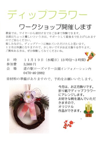 体験日 11月19日(水) 時間 10時~11時30分 90分 参加費 2,000円 季節に合わせた […]
